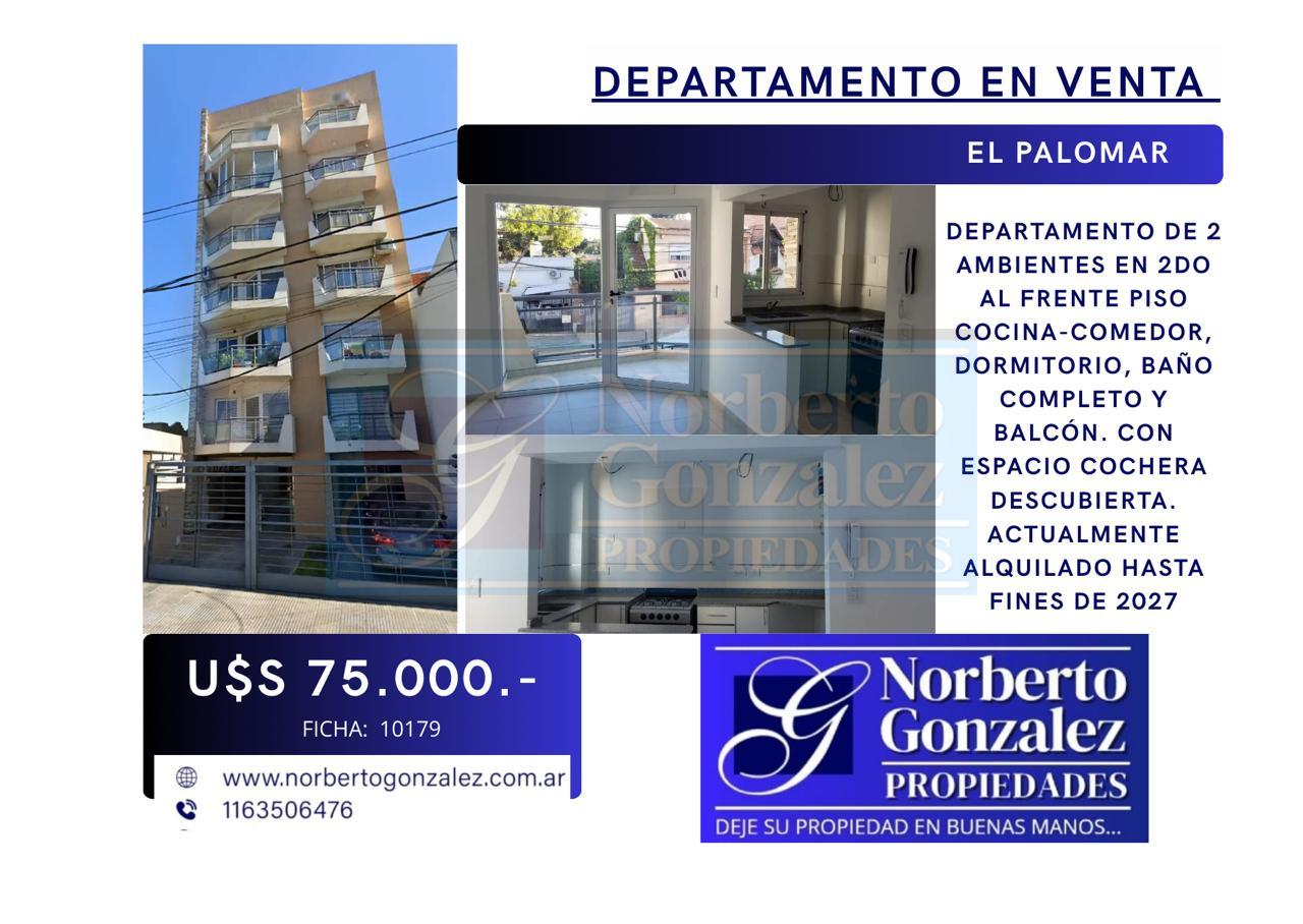 EN PALOMAR EN VENTA DEPARTAMENTO DE 2 AMBIENTES EN 2DO AL FRENTE PISO COCINA-COMEDOR, DORMITORIO, BAÑO COMPLETO Y BALCÓN. CON ESPACIO COCHERA DESCUBIERTA. ACTUALMENTE ALQUILADO HASTA FINES DE 2027.