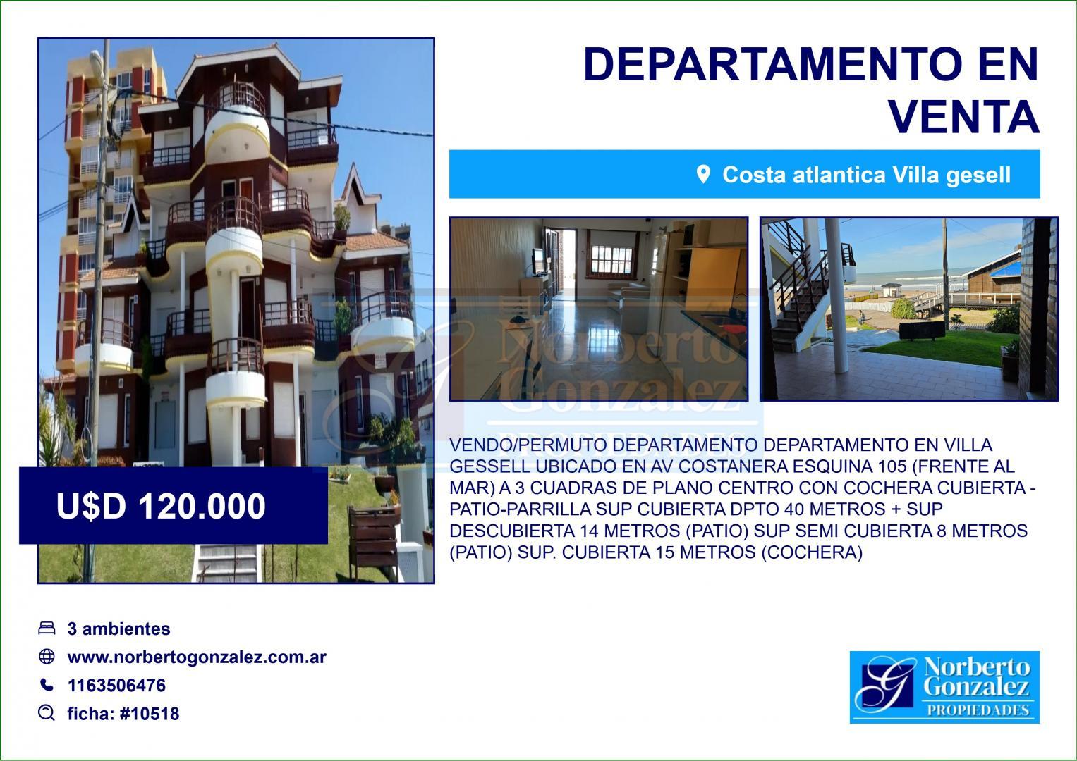 VENDO/PERMUTO DEPARTAMENTO DEPARTAMENTO EN VILLA GESSELL ubicado en av costanera esquina 105 (frente al mar) a 3 cuadras de plano centro con cochera cubierta -patio-parrilla Sup cubierta dpto 40 metros + sup descubierta 14 metros (patio) sup semi cubierta 8 metros (patio) sup. cubierta 15 metros (cochera)