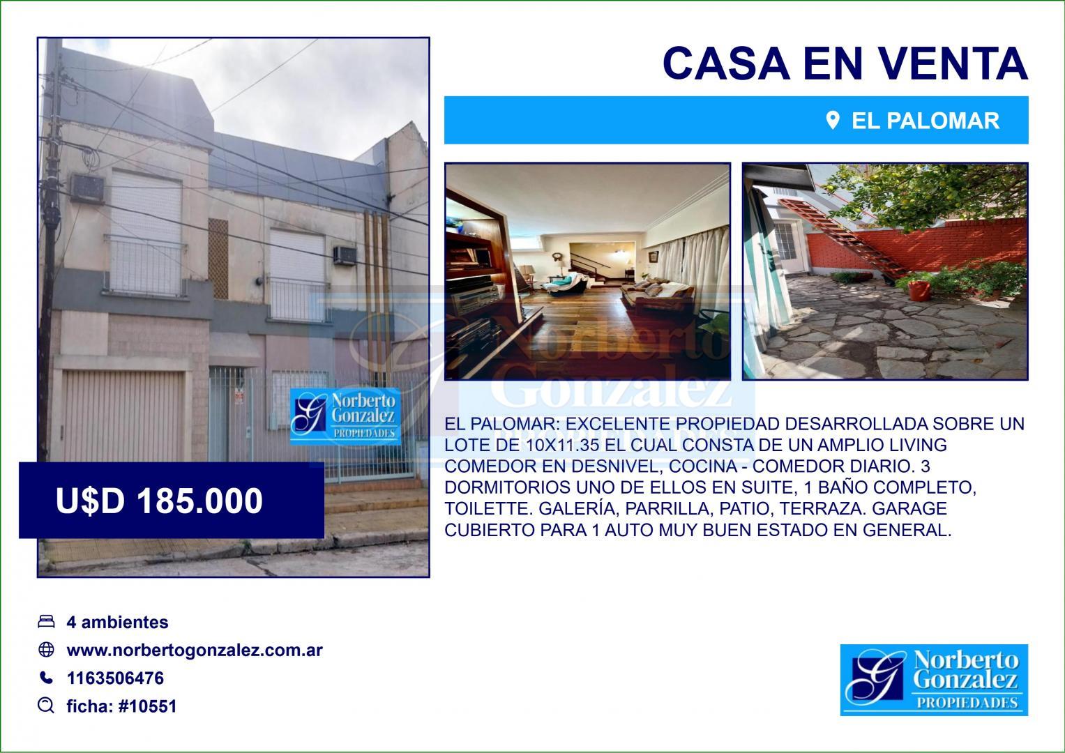 EL PALOMAR: Excelente Propiedad desarrollada sobre un Lote de 10x11.35 el cual consta de un amplio Living comedor en desnivel, cocina - comedor diario. 3 dormitorios uno de ellos en suite, 1 baño completo, Toilette. Galería, Parrilla, patio, terraza. Garage cubierto para 1 Auto Muy Buen Estado en general.