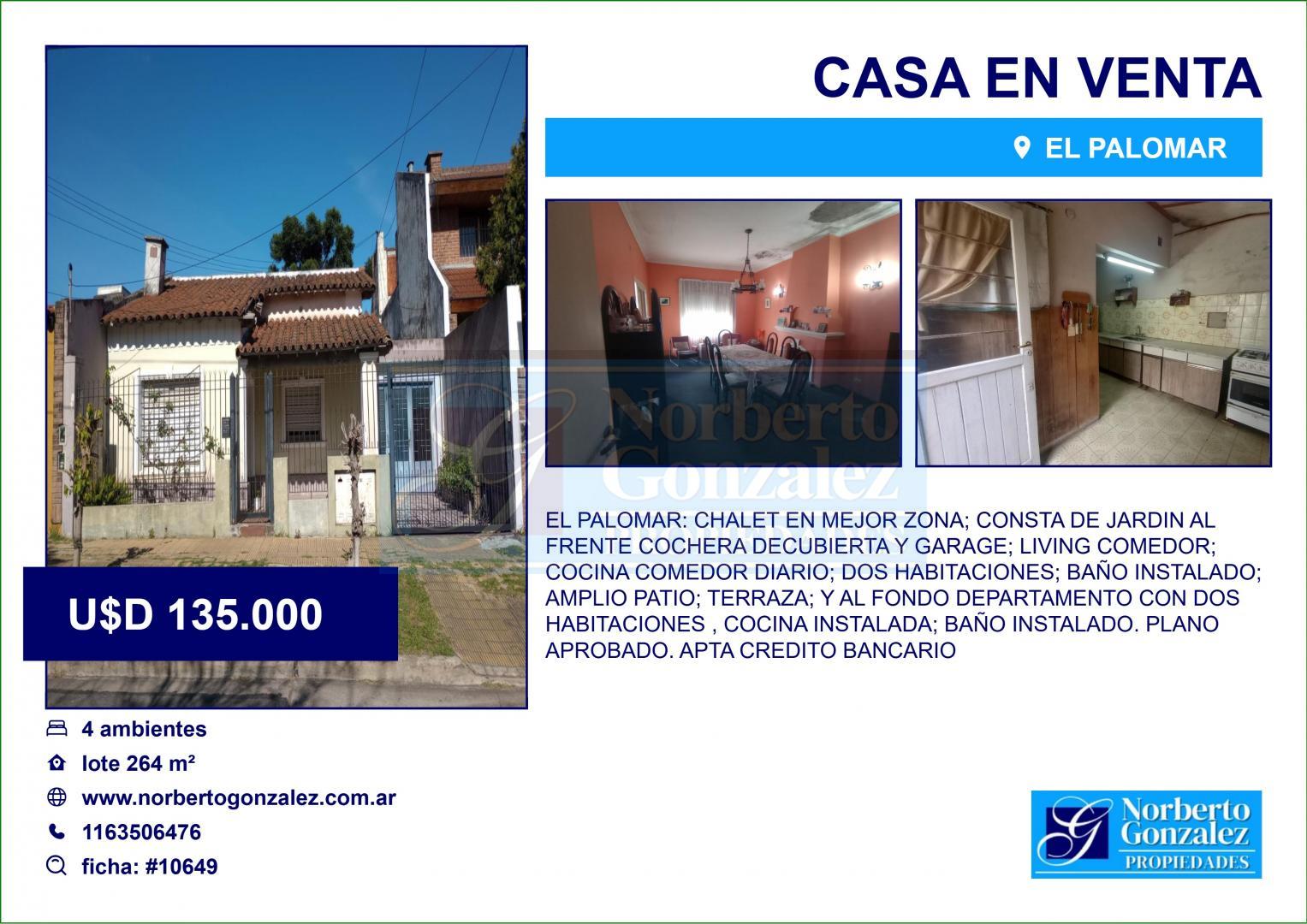 EL PALOMAR: CHALET EN MEJOR ZONA; CONSTA DE JARDIN AL FRENTE COCHERA DECUBIERTA Y GARAGE; LIVING COMEDOR; COCINA COMEDOR DIARIO; DOS HABITACIONES; BAÑO INSTALADO; AMPLIO PATIO; TERRAZA; Y AL FONDO DEPARTAMENTO CON DOS HABITACIONES , COCINA INSTALADA; BAÑO INSTALADO. PLANO APROBADO. APTA CREDITO BANCARIO