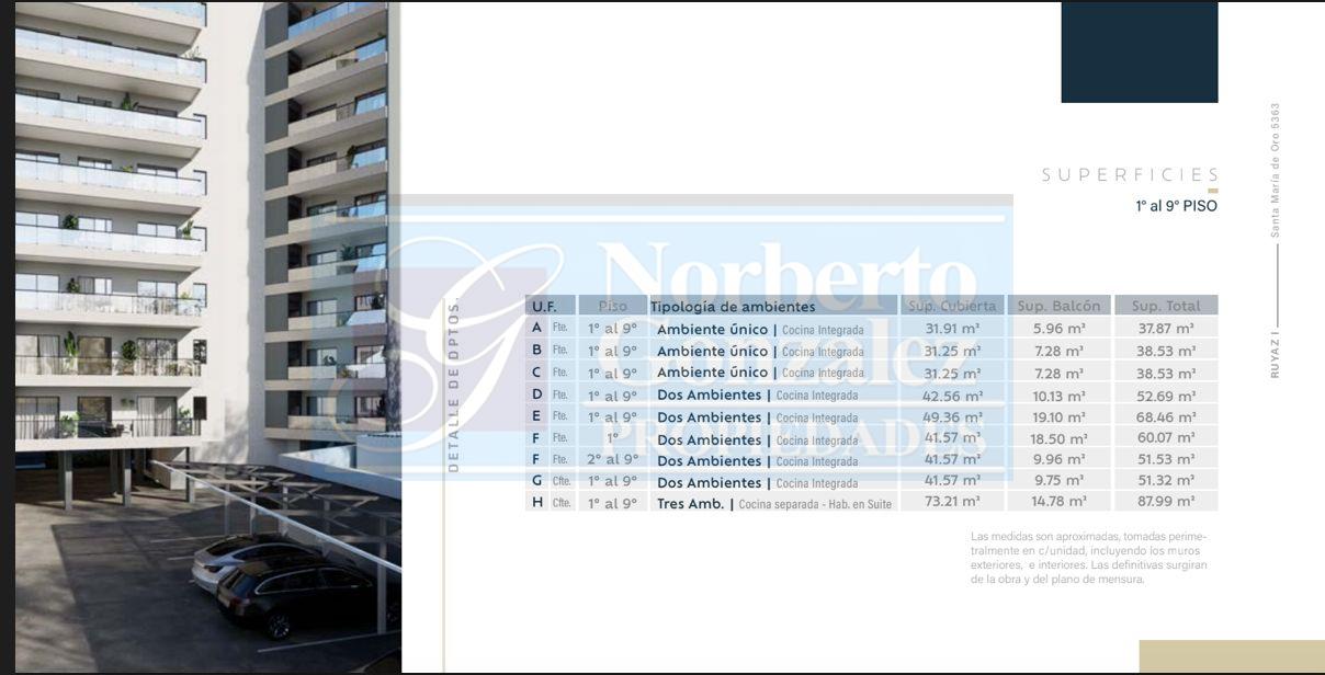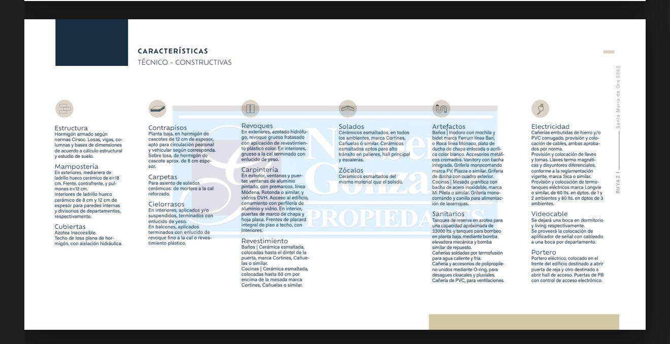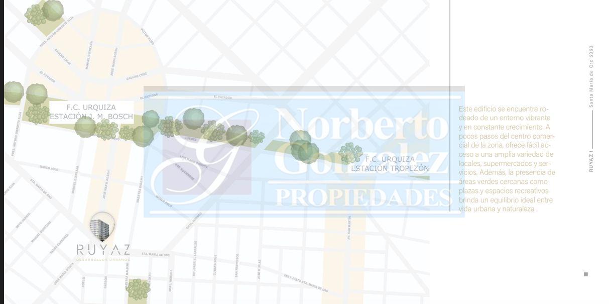 VILLA BOSCH: Santa María de Oro 5363 Tu hogar, tu lugar, una inversión que crece. Ubicado en la esquina de José María Bosch y Santa María de Oro, en el corazón de Villa Bosch, este nuevo desarrollo inmobiliario redefine el confort urbano con una propuesta que combina diseño, calidad constructiva y ubicación estratégica. A pocos pasos del centro comercial, rodeado de cafeterías, locales, servicios y espacios verdes, y con excelente conectividad gracias a la estación J. M. Bosch del Ferrocarril Urquiza y múltiples líneas de colectivos, Santa María de Oro 5363 ofrece un estilo de vida moderno, cómodo y funcional, con todo lo que necesitas al alcance de tu mano. El Edificio: 9 pisos y 72 unidades funcionales. Departamentos de 1, 2 y 3 ambientes, amplios, luminosos y de diseño contemporáneo. Amplios balcones con parrilla individual. Cocheras cubiertas y descubiertas. Dos ascensores con 10 paradas cada uno. Hall de ingreso jerarquizado con detalles de categoría. Calidad Constructiva: Cada detalle fue pensado para garantizar durabilidad, confort y eficiencia energética. Estructura de hormigón armado según normas Cirsoc. Mampostería de ladrillo hueco cerámico, con excelente aislación térmica y acústica. Cubierta de losa de hormigón con aislación hidráulica. Revoques exteriores con revestimiento plástico texturado y color definido por proyecto. Cielorrasos interiores aplicados o suspendidos, con terminaciones en yeso. Detalles de Terminación: Carpinterías de aluminio línea Módena o similar, con vidrios DVH (doble vidriado hermético). Pisos cerámicos esmaltados de primeras marcas (Cañuelas, Cortines o similar). Baños revestidos hasta el dintel, con artefactos Ferrum o Roca, y griferías FV o Piazza. Cocinas equipadas con mesadas de granito, bachas de acero inoxidable y grifería monocomando. Muebles bajo mesada y alacenas incluidos. Preinstalación para aire acondicionado en todos los ambientes principales. Instalación de gas en departamentos de 2 y 3 ambientes con cocina Longvie o similar; monoambientes con anafe vitrocerámico y horno eléctrico. Parrillas individuales revestidas en ladrillo refractario en cada unidad. Portero eléctrico y control de acceso electrónico para mayor seguridad. Comodidad y Seguridad: Cocheras cubiertas y descubiertas en planta baja, con circulación práctica y segura. Tanques de reserva de gran capacidad (33.000 litros totales) y sistema de bombeo presurizado. Instalaciones eléctricas embutidas con disyuntores y llaves termo magnéticas según normativa vigente. Santa María de Oro 5363 es ideal tanto para quienes buscan su primer hogar como para quienes desean invertir en una zona en pleno crecimiento. Un edificio con diseño moderno, materiales de calidad y financiación en cuotas accesibles. Vivir en Santa María de Oro 5363 es elegir confort, ubicación y calidad. Un espacio para disfrutar. Una inversión que crece.