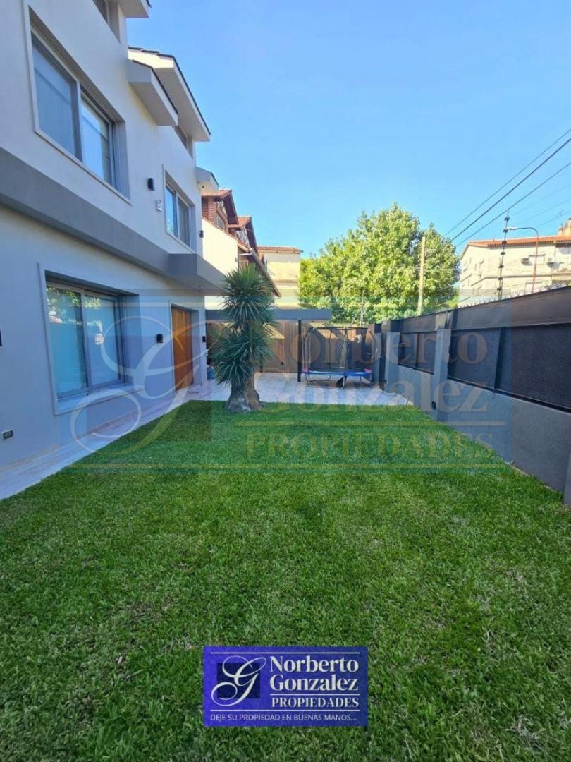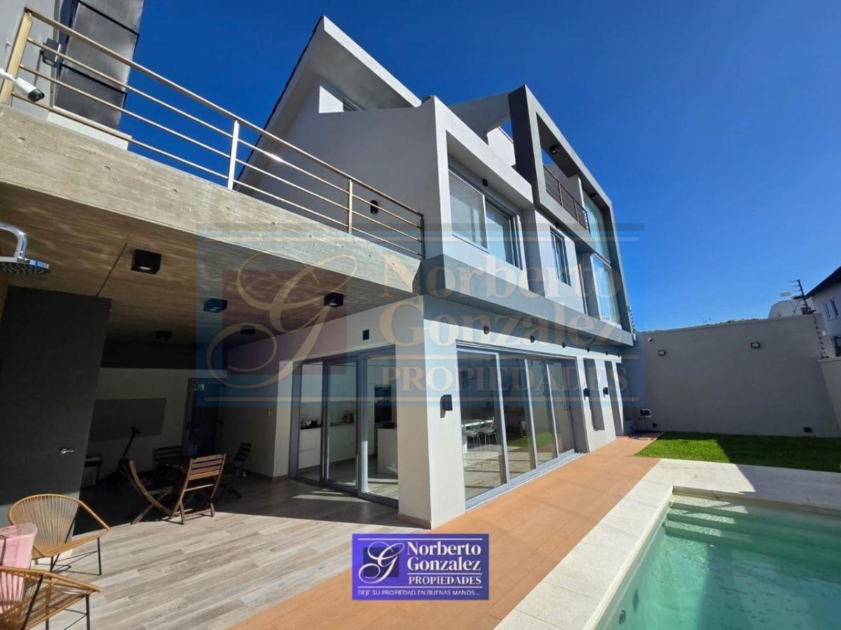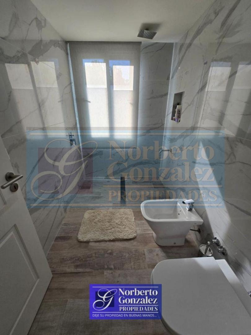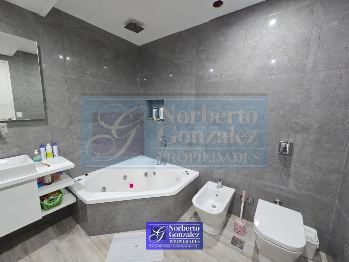 Ciudad Jardin Espectacular casa a estrenar en 3 plantas Propiedad de diseño moderno, con ambientes amplios, funcionales y excelente calidad constructiva. Planta baja: Amplio living-comedor con cocina integrada en concepto abierto, equipada con barra desayunadora. Grandes ventanales de PVC con doble vidrio que aportan luminosidad y eficiencia térmica. Toilette de recepción, baño adicional y cuarto destinado a despensa. Primer piso: Dormitorio principal en suite con baño, vestidor y acceso a terraza privada con conexión para jacuzzi. Dos dormitorios con placard y baño completo. Segundo piso: Gran playroom de aproximadamente 60 m², con posibilidad de subdividirse en hasta 3 habitaciones. Lavadero completo y balcón terraza. Exterior: Entrada para auto techada. Amplio quincho cubierto con parrilla. Jardín con pileta climatizada. Detalles y equipamiento: Caldera Losa radiante en toda la casa (incluye quincho y terraza privada) Aberturas de PVC con doble vidrio (DVH) Cortinas eléctricas Portón automático Preparada para sistema de domótica Aire acondicionado en todos los ambientes Jacuzzi en uno de los baños