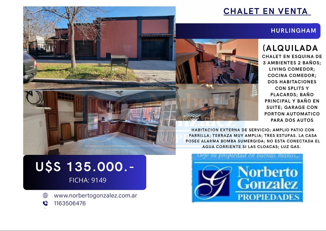 (ALQUILADA) EN VENTA EN HURLINGHAM CHALET EN ESQUINA DE 3 AMBIENTES 2 BAÑOS; LIVING COMEDOR; COCINA COMEDOR; DOS HABITACIONES CON SPLITS Y PLACARDS; BAÑO PRINCIPAL Y BAÑO EN SUITE; GARAGE CON PORTON AUTOMATICO PARA DOS AUTOS HABITACION EXTERNA DE SERVICIO; AMPLIO PATIO CON PARRILLA; TERRAZA MUY AMPLIA; TRES ESTUFAS. LA CASA POSEE ALARMA BOMBA SUMERGIDA; NO ESTA CONECTADA EL AGUA CORRIENTE SI LAS CLOACAS; LUZ GAS.