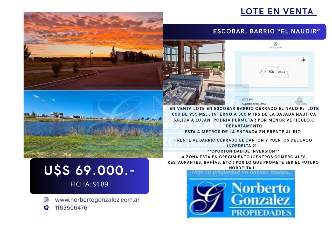 EN VENTA LOTE EN ESCOBAR BARRIO CERRADO EL NAUDIR; LOTE 800 DE 955 M2, . INTERNO A 300 MTRS DE LA BAJADA NAUTICA SALIDA A LUJAN. PODRIA PERMUTAR POR MENOR VEHICULO O DEPARTAMENTO ESTA A METROS DE LA ENTRADA EN FRENTE AL RIO EL NAUDIR propone un estilo de vida náutico diferente para disfrutar al aire libre. Un ámbito ideal y equilibrado para vivir lejos de la ciudad y en un entorno donde poder hallar los servicios de salud, educación y centros comerciales. EL NAUDIR está pensado para los que eligen una mejor calidad de vida; para los que la exclusividad tanto como la privacidad son valores que se reconocen a simple vista. * Posesión inmediata y apto para construir. * Servicios completos y subterráneos: luz, agua y cloacas, gas natural. * 46 has de agua para disfrutar con dos entradas, una principal y una de servicios. * Área náutica en la que se encontrará un puerto con amarras y salida directa al Río Luján, ideal para que sus residentes puedan practicar una amplia variedad de actividades náuticas. *Excelentes espacios de uso común y una amplia gama de amenities y servicios. * Salón de Usos Múltiples. * Club House de más de 500 m2, con vista a la laguna central. * Restaurante de 240 m2. de diseño desarrollado sobre la laguna principal con excelente vista y apta para deportes acuáticos. * 2 Piscinas una exterior y otra in-out semi olímpica que miran hacia la laguna central del barrio, un sector de juegos para niños, Gimnasio con vista a laguna central. * Areas deportivas, con 3 canchas de tenis y una cancha para jugar al futbol. Asimismo un área de juegos para los mas chicos. Esta ubicado en el partido de Escobar sobre ruta 25 (Nuevo Cazador), excelente acceso desde ruta 9 km. 44. Al ingresar por el puente, se debe circular aproximadamente 3 km de asfalto, doblando sobre calle Libertad, por aproximadamente 4 km hasta llegar a la ruta 25. Frente al Barrio Cerrado El Cantón y Puertos del Lago (Nordelta 2). **OPORTUNIDAD DE INVERSIÓN** La zona está en crecimiento (Centros comerciales, Restaurantes, Bahías, etc.) por lo que promete ser el futuro Nordelta II.