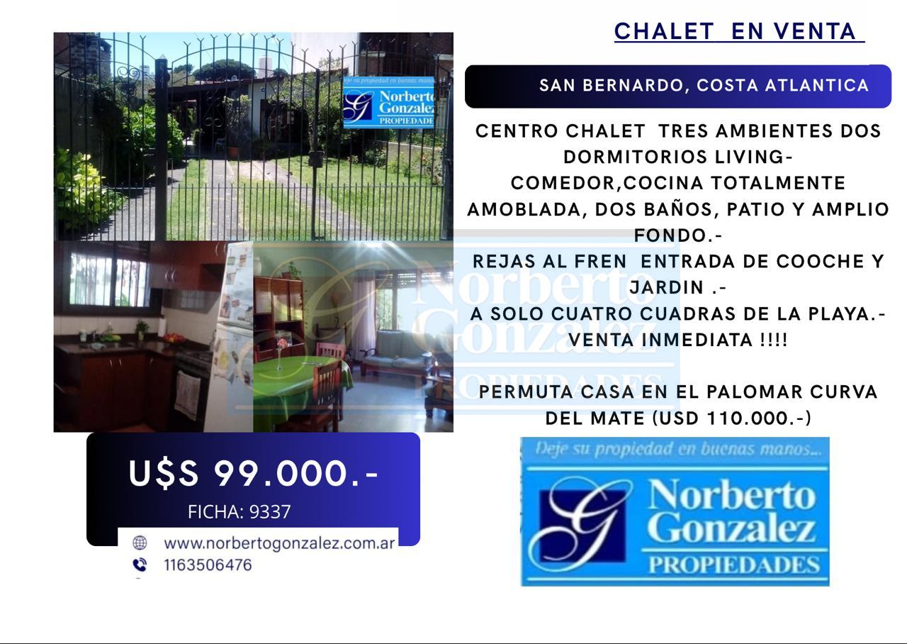 SE VENDE EN SAN BERNARDO CENTRO CHALET TRES AMBIENTES DOS DORMITORIOS LIVING- COMEDOR,COCINA TOTALMENTE AMOBLADA, DOS BAÑOS, PATIO Y AMPLIO FONDO.- REJAS AL FREN ENTRADA DE COOCHE Y JARDIN .- A SOLO CUATRO CUADRAS DE LA PLAYA.- VENTA INMEDIATA !!!! PERMUTA CASA EN EL PALOMAR CURVA DEL MATE (USD 110.000.-)