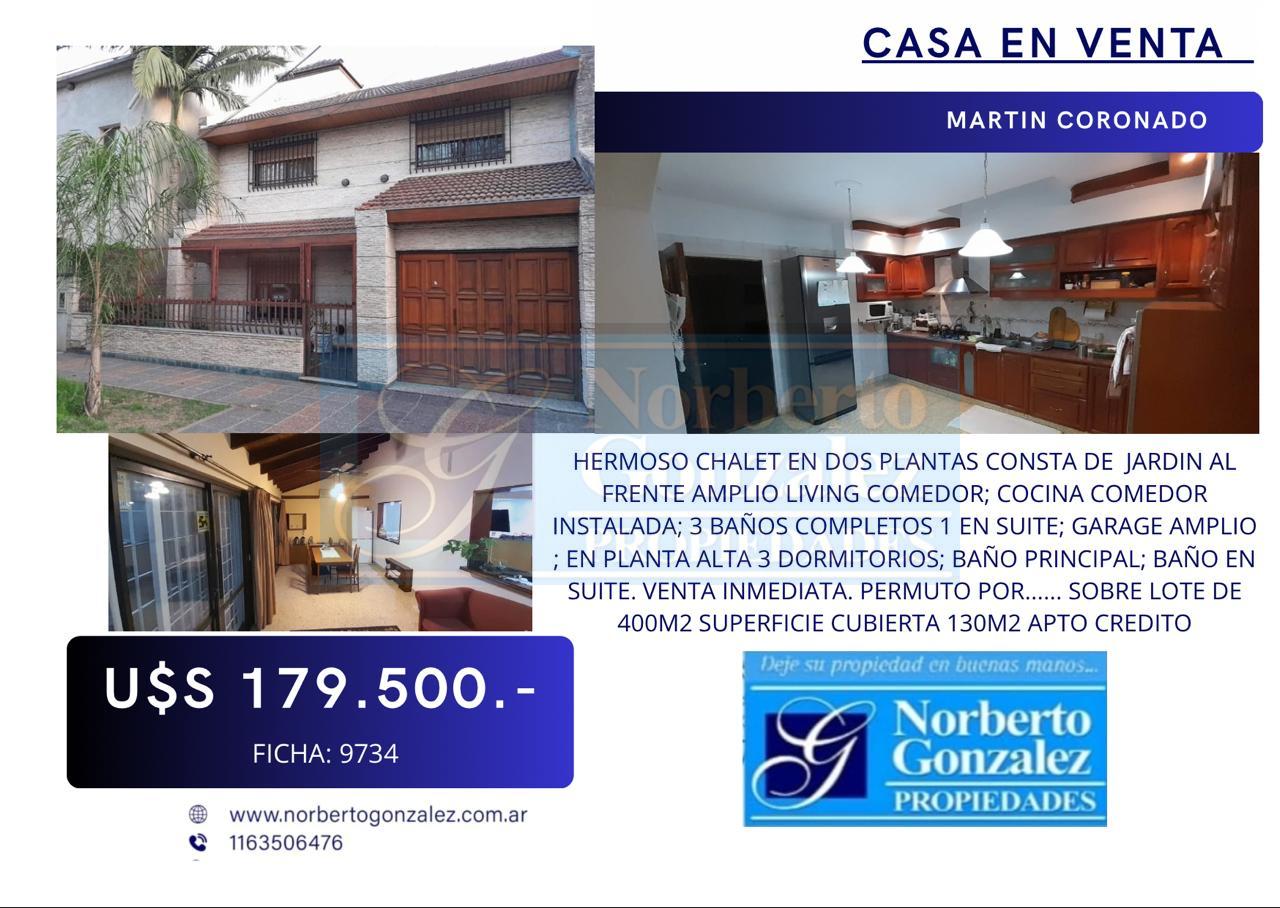 EN VENTA EN MARTIN CORONADO HERMOSO CHALET EN DOS PLANTAS CONSTA DE JARDIN AL FRENTE AMPLIO LIVING COMEDOR; COCINA COMEDOR INSTALADA; 3 BAÑOS COMPLETOS 1 EN SUITE; GARAGE AMPLIO ; EN PLANTA ALTA 3 DORMITORIOS; BAÑO PRINCIPAL; BAÑO EN SUITE. VENTA INMEDIATA. PERMUTO POR...... SOBRE LOTE DE 400M2 SUPERFICIE CUBIERTA 130M2 APTO CREDITO