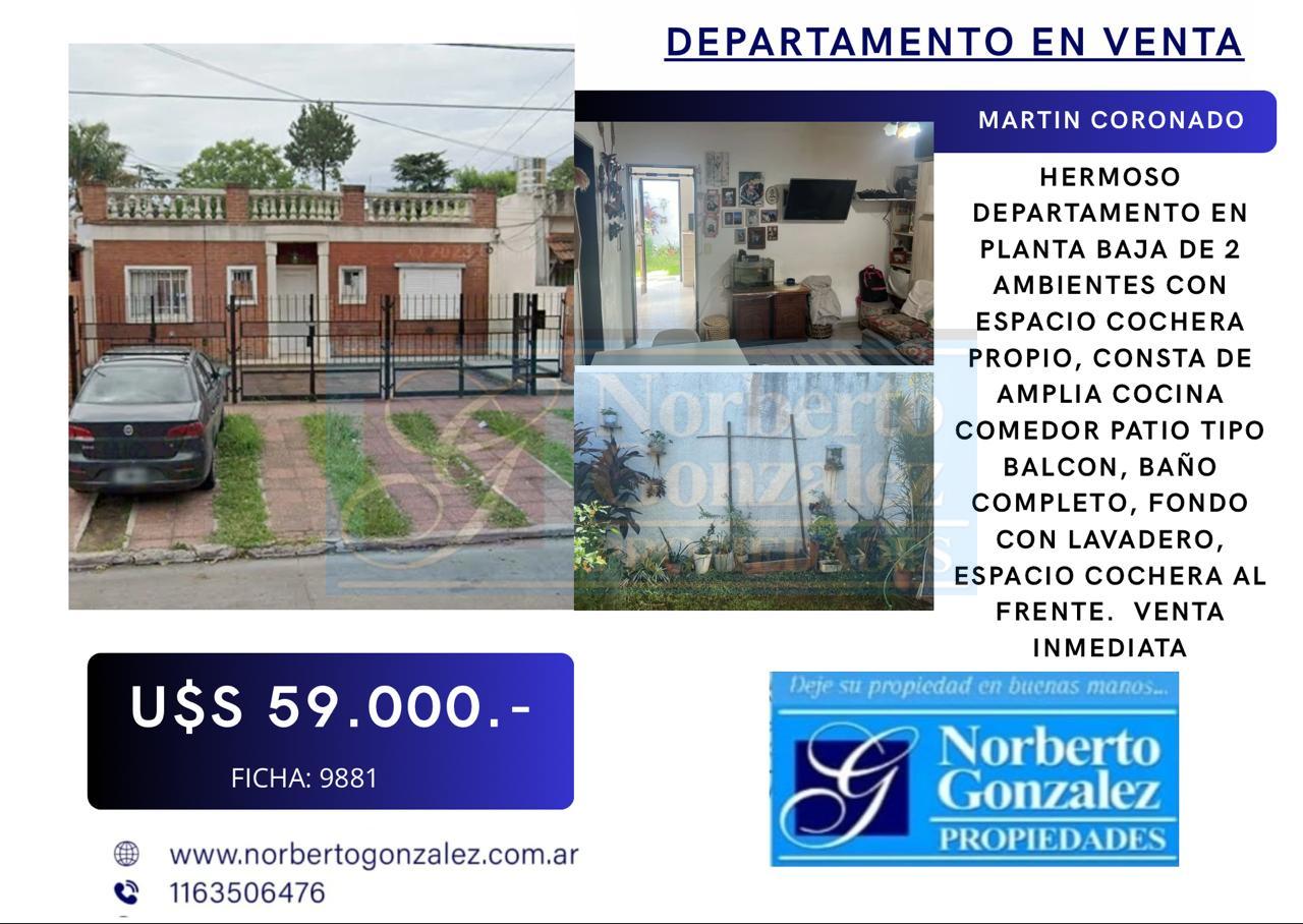 EN VENTA EN MARTIN CORONADO HERMOSO DEPARTAMENTO EN PLANTA BAJA DE 2 AMBIENTES CON ESPACIO COCHERA PROPIO, CONSTA DE AMPLIA COCINA COMEDOR PATIO TIPO BALCON, BAÑO COMPLETO, FONDO CON LAVADERO, ESPACIO COCHERA AL FRENTE. VENTA INMEDIATA