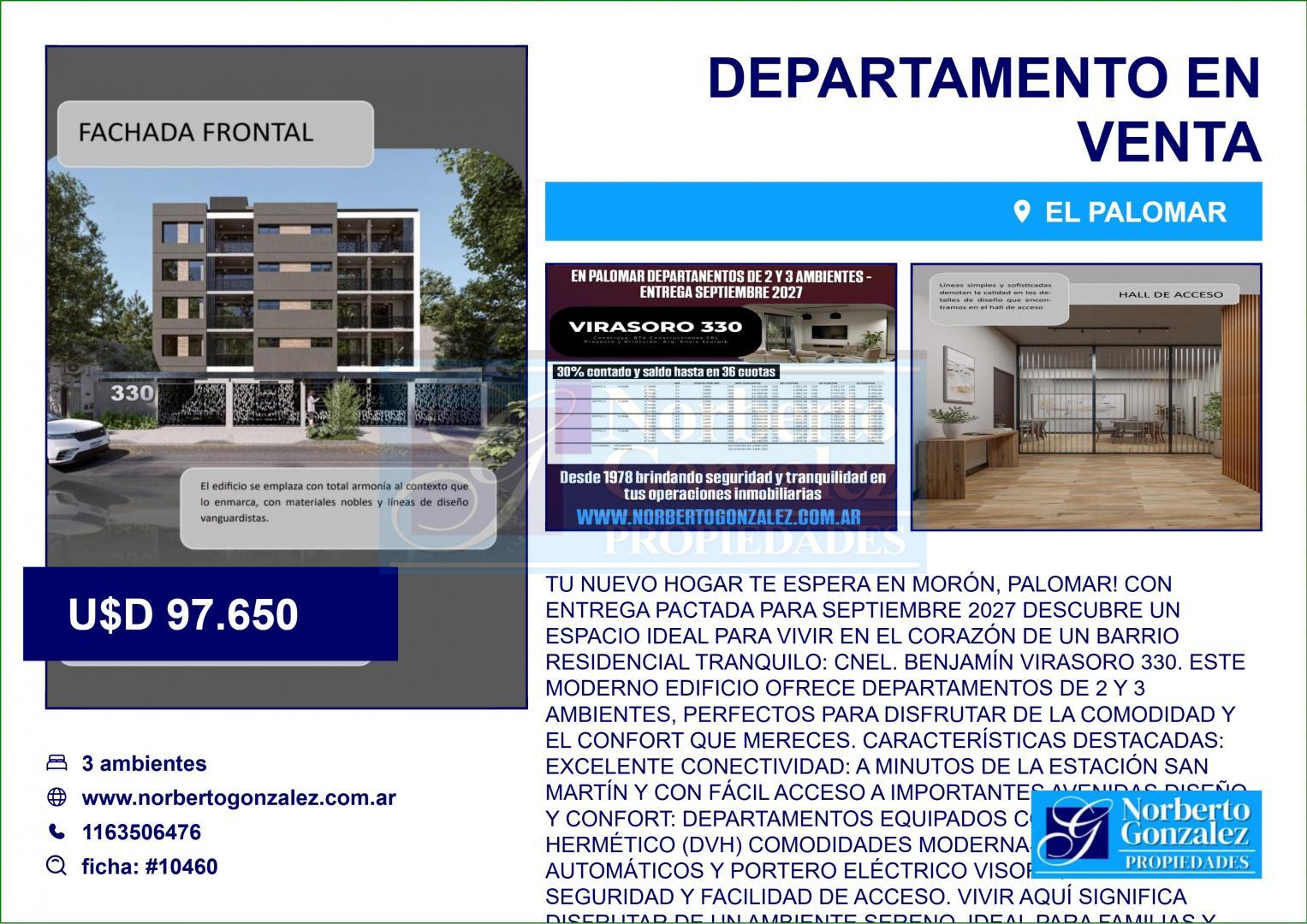 Tu nuevo hogar te espera en Morón, Palomar! Con entrega pactada para SEPTIEMBRE 2027 Descubre un espacio ideal para vivir en el corazón de un barrio residencial tranquilo: Cnel. Benjamín Virasoro 330. Este moderno edificio ofrece departamentos de 2 y 3 ambientes, perfectos para disfrutar de la comodidad y el confort que mereces. Características destacadas: Excelente conectividad: A minutos de la estación san Martín y con fácil acceso a importantes avenidas Diseño y confort: Departamentos equipados con Doble Vidrio Hermético (DVH) Comodidades modernas: Ascensores automáticos y portero eléctrico visor que garantizan seguridad y facilidad de acceso. Vivir aquí significa disfrutar de un ambiente sereno, ideal para familias y profesionales que buscan calidad de vida sin alejarse de la ciudad. No pierdas la oportunidad de formar parte de esta maravillosa comunidad! Contáctanos para más información y descubre tu nuevo hogar en palomar.